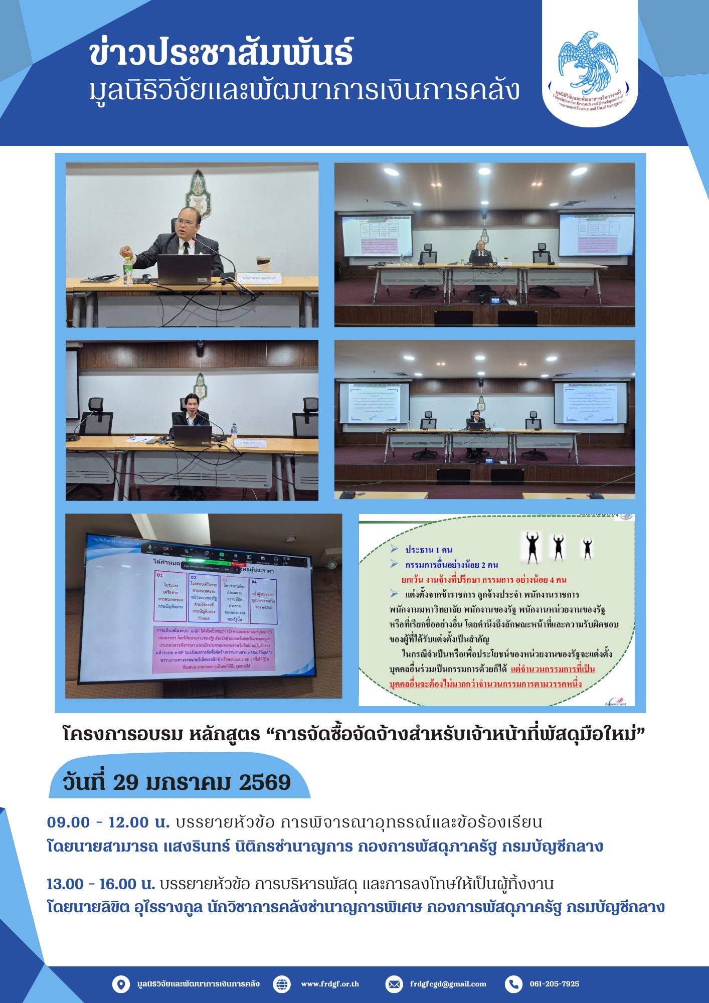 มูลนิธิวิจัยและพัฒนาการเงินการคลังได้ดำเนินการจัดโครงการอบรม หลักสูตร “การจัดซื้อจัดจ้างสำหรับเจ้าหน้าที่พัสดุมือใหม่” ให้กับบุคลากรของหน่วยงานภาครัฐ ระหว่างวันที่ 27 - 29 มกราคม 2569 ในรูปแบบ Online ผ่านทางโปรแกรม Zoom Meeting