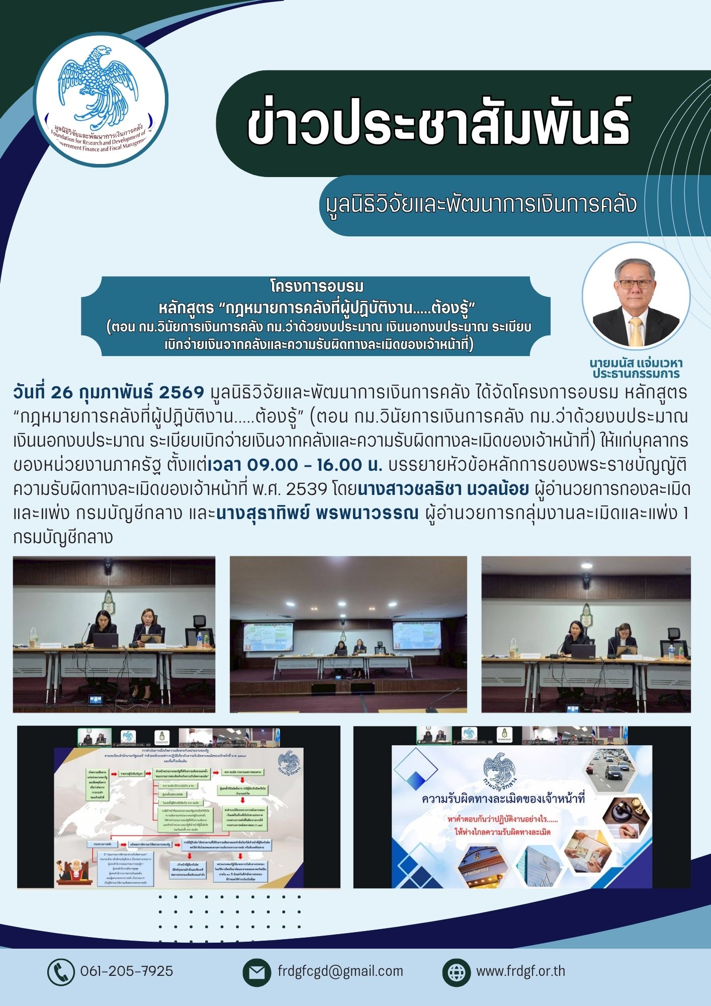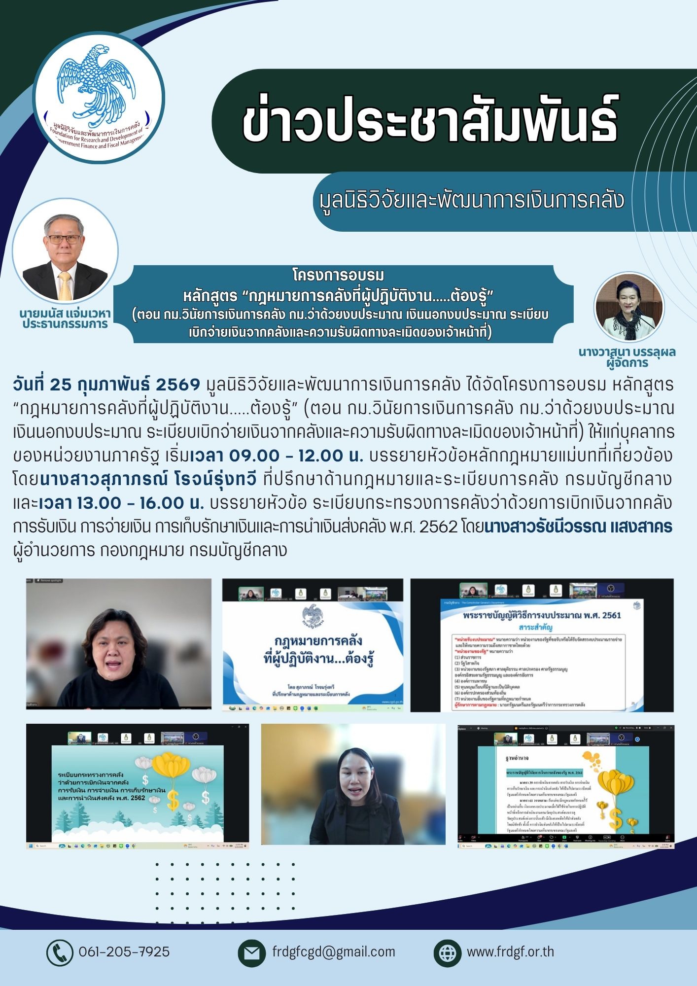 มูลนิธิวิจัยและพัฒนาการเงินการคลัง จัดโครงการอบรม หลักสูตร “กฎหมายการคลังที่ผู้ปฏิบัติงาน.....ต้องรู้” (ตอน กม.วินัยการเงินการคลัง กม.ว่าด้วยงบประมาณ เงินนอกงบประมาณ ระเบียบเบิกจ่ายเงินจากคลัง และความรับผิดทางละเมิดของเจ้าหน้าที่) สำหรับเจ้าหน้าที่ของรัฐในหน่วยงานทุกประเภท ระดับบริหาร และระดับปฏิบัติการที่ปฏิบัติงานหรือได้รับมอบหมายให้ปฏิบัติงานเกี่ยวกับการเงินการคลัง และความรับผิดทางละเมิดและทางแพ่ง ของหน่วยงานของรัฐทั้งในส่วนกลางและส่วนภูมิภาค องค์กรปกครองส่วนท้องถิ่น รัฐวิสาหกิจและหน่วยงานอื่นของรัฐที่อยู่ภายใต้พระราชบัญญัติความรับผิดทางละเมิดของเจ้าหน้าที่ พ.ศ. 2539 ในวันที่ 25 – 26 กุมภาพันธ์ 2569 เวลา 09.00 น. ถึง 16.00 น. ผ่านโปรแกรม Zoom Meeting
